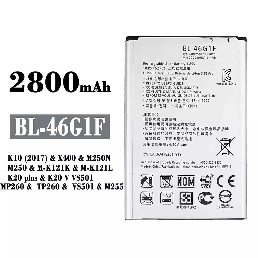 Battery model BL-46G1F for LG K10 (2017) / X400 / M250N / M250 / M-K121K / M-K121L / K20 plus / K20 V VS501 / MP260 / TP260 / VS501 / M255