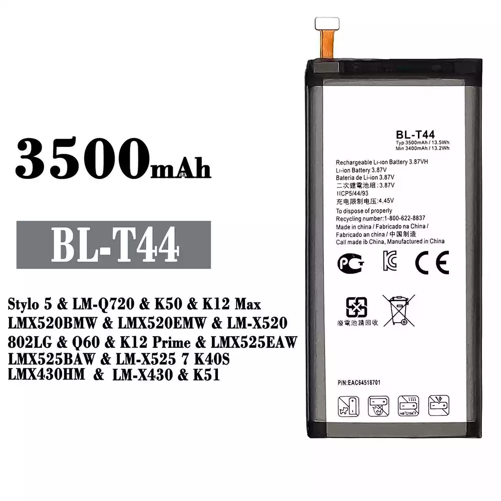 Battery model BL-T44 for LG Stylo 5 / LM-Q720 / K50 / K12 Max / LMX520BMW / LMX520EMW / LM-X520 / 802LG / Q60 / K12 Prime / LMX525EAW / LMX525BAW / LM-X525 7 K40S / LMX430HM / LM-X430 / K51
