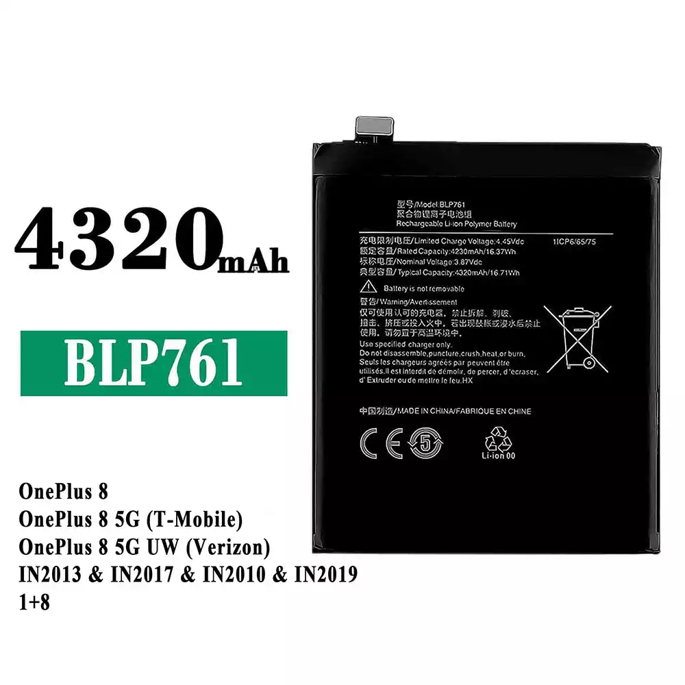 Battery model BLP761 for OPPO OnePlus 8 / OnePlus 8 5G (T-Mobile) / OnePlus 8 5G UW (Verizon) / IN2013 / IN2017 / IN2010 / IN2019 1+8