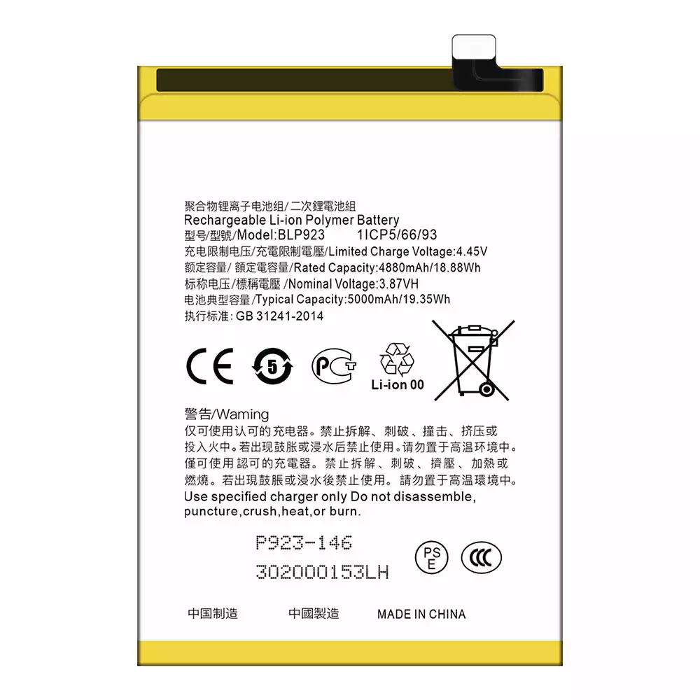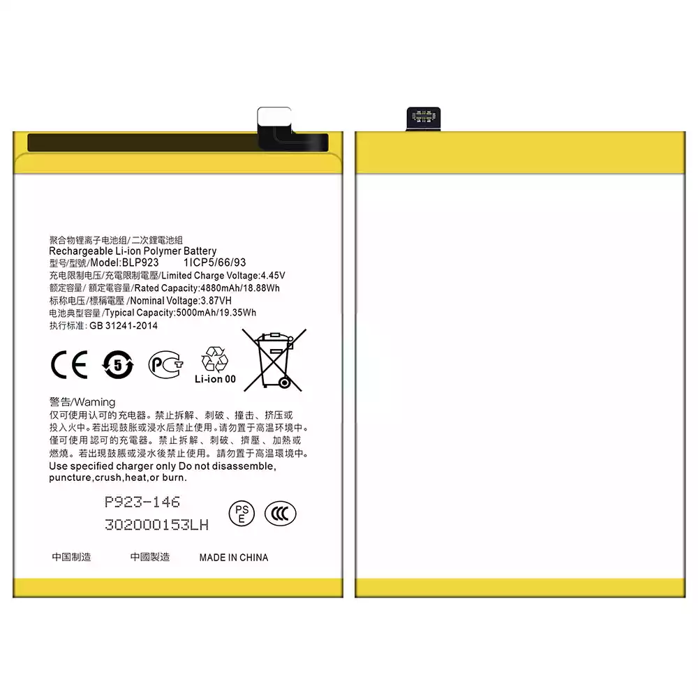 Battery model BLP923 for OPPO A57 2020 /A57 4G 2022 /A57 2022 /A77 4G /A77 5G /A77s /A78 5G /A97 5G / K10 5G / OnePlus Nord N20 SE /OnePlus Nord N300 5G /Realme C51