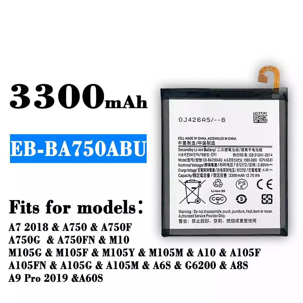 Battery model EB-BA750ABU for Samsung A7 2018/A750/A750F/A750G/A750FN/M10/M105G/M105F/M105Y/M105M/A10/A105F/A105FN/A105G/A105M/A6S/G6200/A8S/A9 Pro 2019/A60S